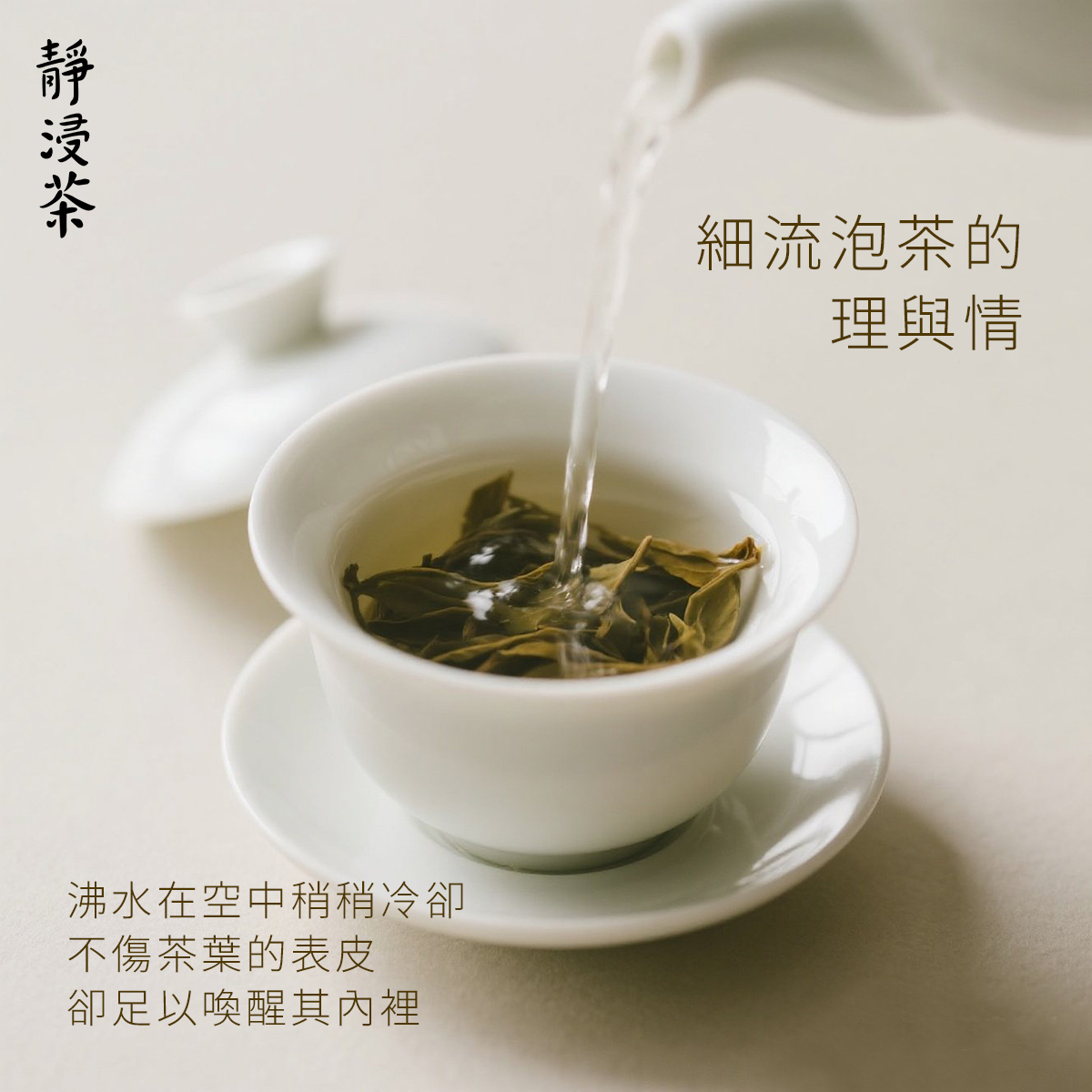 細流注水,水勢輕柔,不驚不擾。熱水順著壺口落下,在空中稍稍冷卻,從沸點退至 90 - 95 度上下。這樣的溫度,不過度萃取表面,也不傷茶葉的表皮,卻足以喚醒其內裡。茶葉一點一滴的舒展開來,茶多酚與咖啡鹼,不再被加快釋出;而芳香物質,則獲得它釋出的時間。溫柔讓甘能勝過苦。